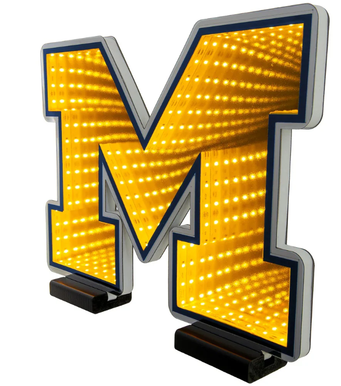 - Brighten any room and showcase your Michigan Wolverines pride with this LED Infinity Logo Light. The mirrored finish adds a touch of modern elegance, while the LED lights cast a vibrant glow on your wall. Measuring approximately 9" x 11.5" x .5", this statement piece includes a 2" deep wood stand for versatile display options, allowing you to showcase your Wolverines spirit on any tabletop or hang it with pride