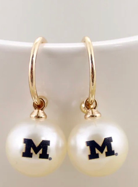 These elegant earrings feature oversized 14mm imitation pearls with Michigan “M” logos on gold-tone open-back huggie hoops. Lightweight yet statement-worthy. Hoops measure ~ .5" in diameter. Designed to coordinate with our matching triple chain pearl pendant necklace.