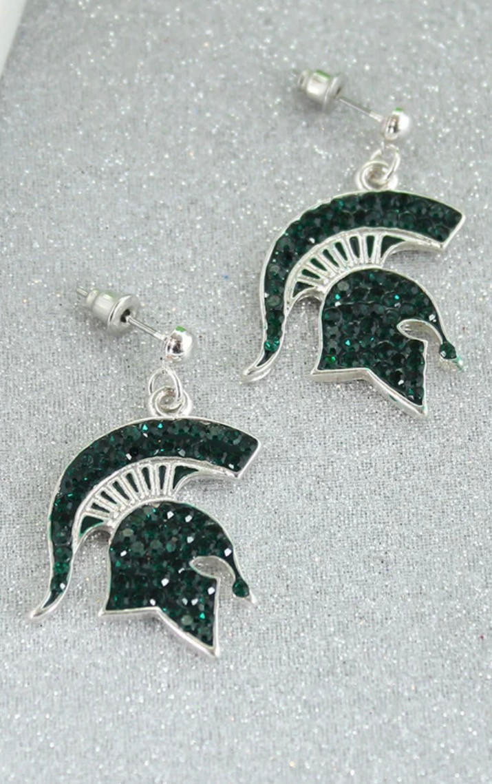 These Michigan State University post back earrings feature vibrant green crystal Spartan helmet logo charms on silver tone settings. Lightweight and comfortable for all-day wear. A perfect match to our MSU logo necklace, bracelet, and pin for a complete game day look!