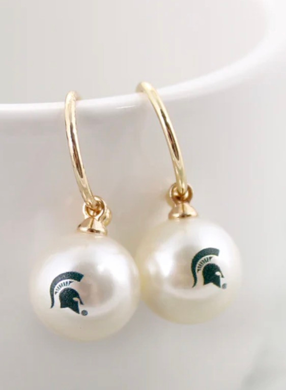 These elegant earrings feature oversized 14mm imitation pearls with Michigan State Spartan helmet logos on gold-tone open-back huggie hoops. Lightweight yet statement-worthy. Hoops measure ~ .5" in diameter. Designed to coordinate with our matching triple chain pearl pendant necklace.
