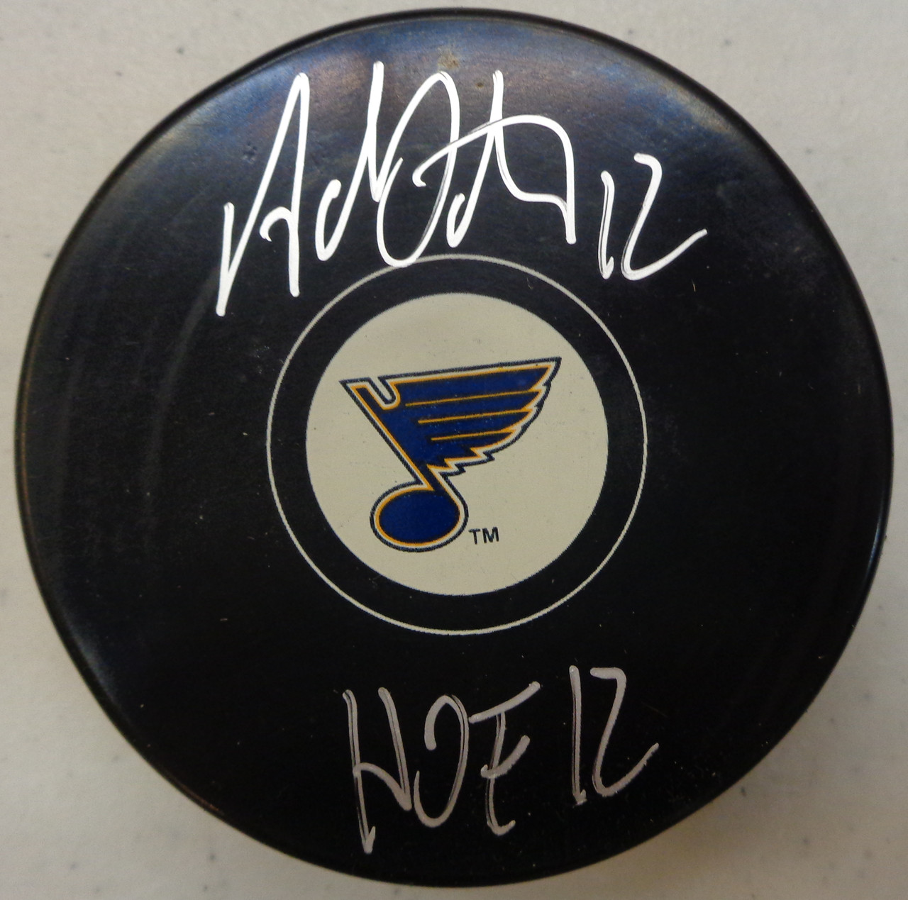 - Adam Oates Autographed St. Louis Blues Souvenir Puck w/ "HOF 12"