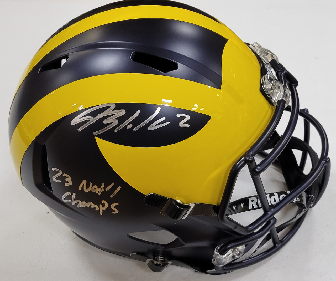 - Blake Corum Autographed University of Michigan Riddell Replica Speed Football Helmet w/ "23 Nat'l Champs"