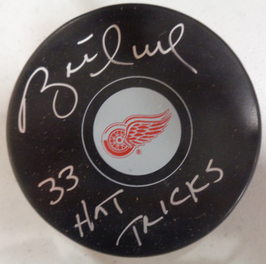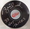- Brett Hull Autographed Detroit Red Wings Souvenir Puck w/ "33 Hat Tricks"